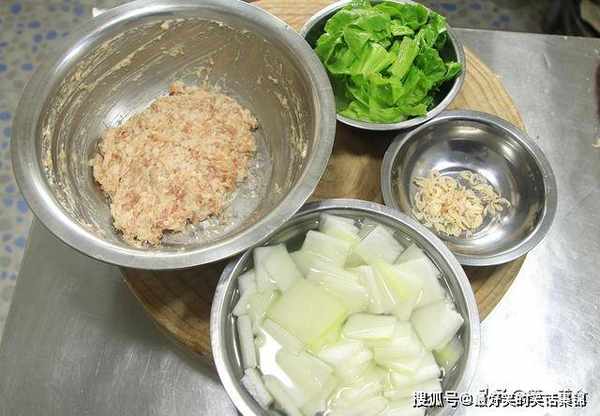 ,去除肉皮后先切成薄片再剁成肉馅,自己剁出来的肉馅,口感好更有嚼劲,剁好以后入在盆中。