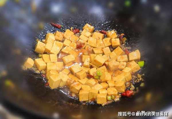 3.锅内烧油,油烧热以后放入葱、姜、干辣椒,开小火翻炒出香味,倒入豆腐不停地摇晃锅以免粘锅,用勺子背轻轻地推炒,不要来回翻动豆腐容易碎,沿锅边