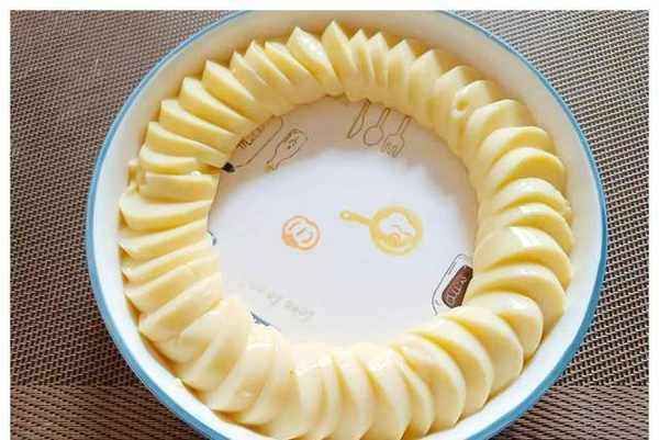 ⑦我们将西兰花切成小块放入蛋液中,摆成一圈。