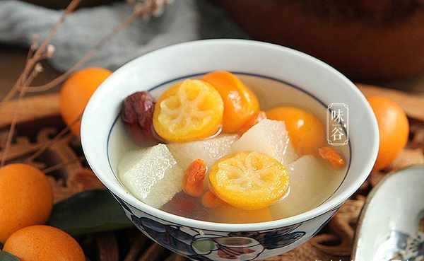 3、汤锅中放入金桔、梨、红枣,倒入适量清水,盖上锅盖,水开后转小火炖30分钟。