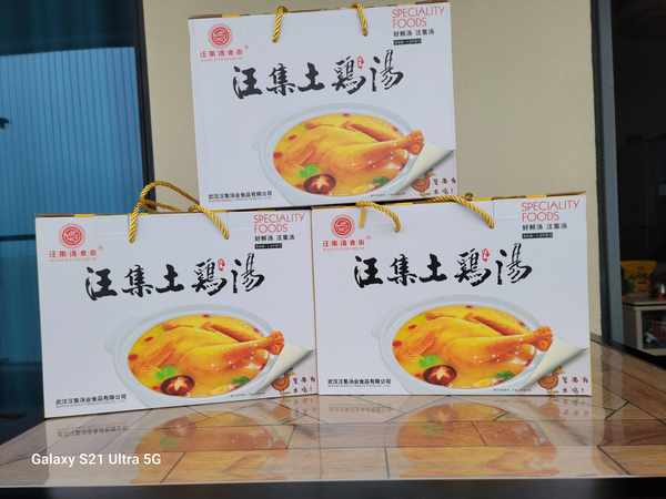 刚收到小弟从武汉寄来的“楚天第一汤”——老家“汪集鸡汤”三件,一件两罐(罐头式包装)。