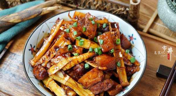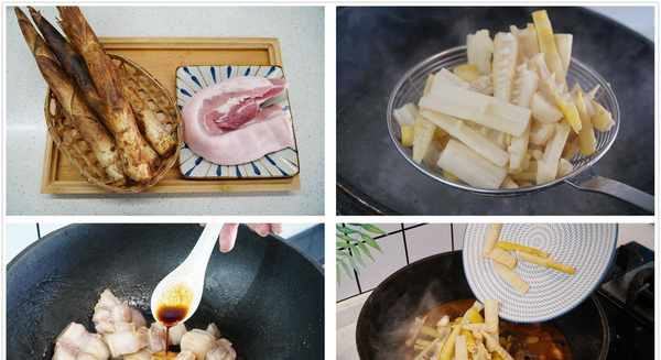 材料:五花肉、春笋、葱、姜、大料、香叶、桂皮、生抽、老抽、盐、冰糖