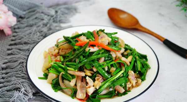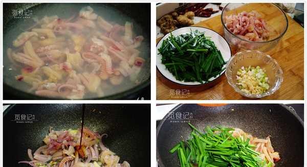 材料:韭菜、鱿鱼丝、葱姜蒜适量、生抽、蚝油、料酒、白胡椒粉1汤匙、盐适量。