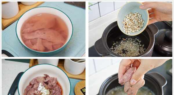 4、猪肝片加入半茶匙胡椒粉、1茶匙料酒、1茶匙生抽、少许淀粉搅拌均匀,倒入1茶匙植物油,在油中腌制10分钟分钟。薏米煮熟后,将腌好的猪肝放入薏米水中煮1分钟。