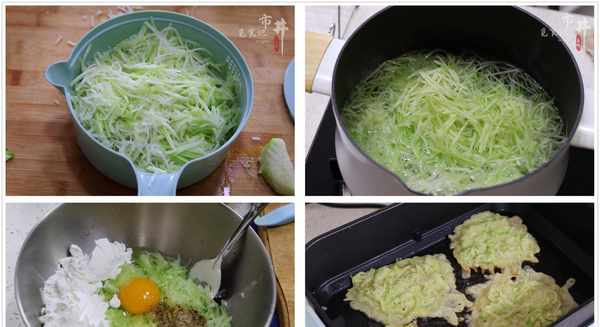1、青萝卜去皮后搓成细丝,锅中烧开水,加入1勺盐,将萝卜丝放入水中焯半分钟,捞出待用。