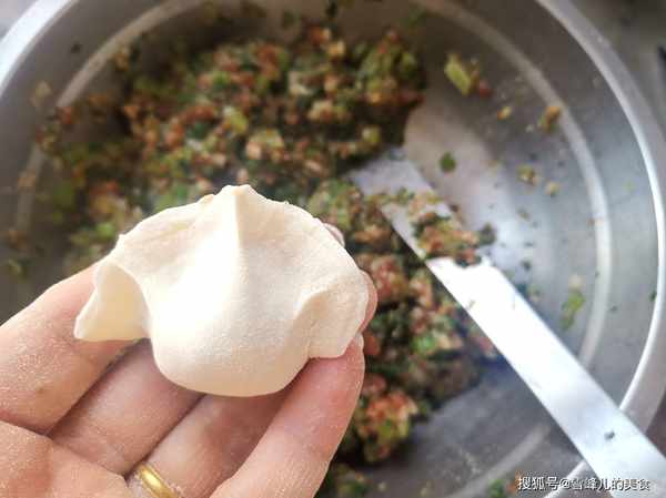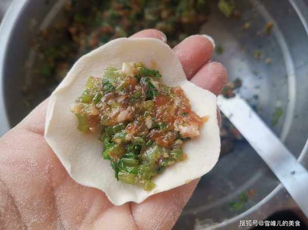 第四步:放上适量的馅料。馅料的多少自己随意就好,看自己的包饺子技术,尽量馅多一点会更好吃。