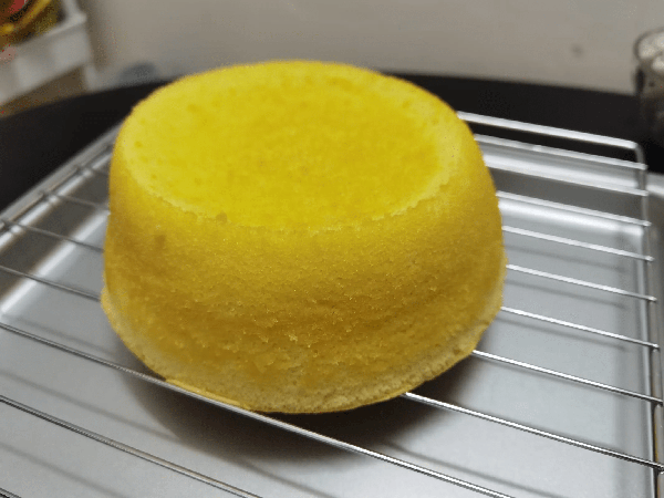 8. 取出烤好的蛋糕,从高处重摔3下后倒扣在烤架网上,等待完全晾凉后脱模。