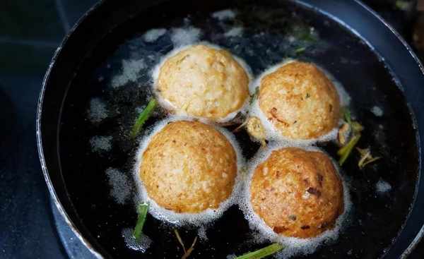 3、将鸡蛋液打散,抹在手上,用手抓取一把肉馅,团成一个球状。然后下锅炸,炸这种大丸子,油温不要烧得太高,五成热左右就够用了。炸的过程中,轻轻晃动锅子,防止糊锅底。