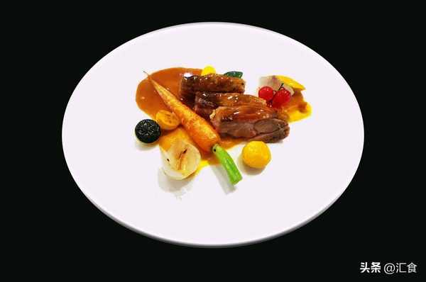 盘中放入南瓜酱、鸭腿、蔬菜,最后淋入熬好的酱汁即可。