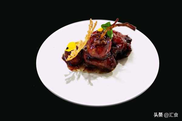 腌制好的鸭腿放入真空袋中抽真空,放入低温机中煮熟,取出后带皮一面放入平底锅煎上色,改刀成块放入烤箱烤上色。