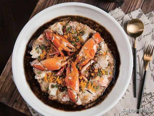 3. 走菜时,往蒸好的蟹肉盘中淋入豉油,撒上香葱末和小米椒碎,淋上热油激香,即成。