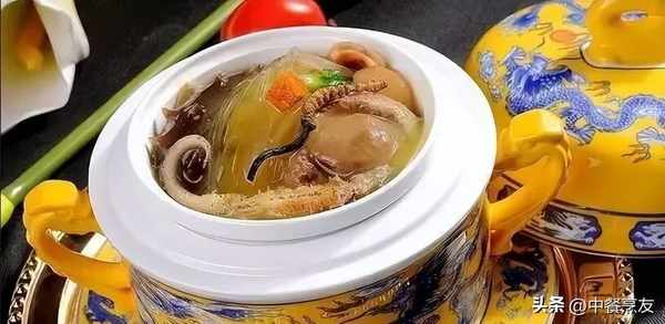 7、取一个绍兴酒坛洗净,加入清水500克,放在微火上烧热,倒净坛中水,坛底放 一个小竹箅,先将煮过的鸡、鸭、羊、肘、猪蹄尖、鸭肫、猪肚块及花冬菇、冬笋块放入,再把鱼翅、火腿片、干贝、鲍鱼片用纱布包成长方形,摆在鸡、鸭等料上,然后倒入煮鸡、鸭等料的汤汁,用荷叶在坛口上封盖着,并倒扣压上一只小碗。装好后,将酒坛置于木炭炉上,用小火煨2小时后启盖,速将刺参、蹄筋、鱼唇、鱼高肚放入坛内,即刻封好坛口,再煨一小时取出,上菜时,将坛口菜胡倒在大盆内,纱布包打开,鸽蛋放在最上面。同时,跟上蓑衣萝卜一碟、火腿拌豆芽一碟、冬菇炒豆苗一碟、油辣芥一碟以及银丝卷、芝麻烧饼佐食。