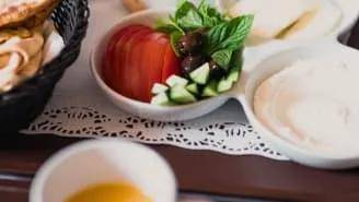 土耳其面包,如 simit,一种圆形种子面包,或 pide,一种耐嚼的大饼,搭配一碗羊乳酪或其他新鲜的咸奶酪;橄榄;哈尔瓦;和蜂蜜和蜜饯。鸡蛋通常用煎过的sucuk片烹制,suuk是一种干牛肉香肠,用大蒜,红辣椒,孜然和漆树调味。