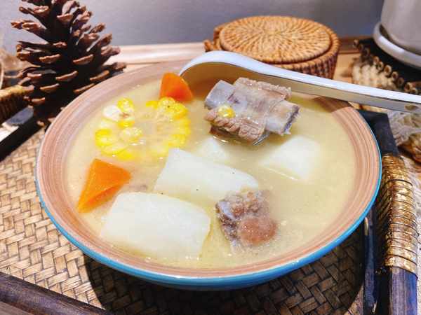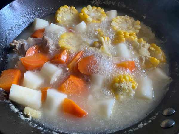 步骤4:1个小时后加玉米、胡萝卜和山药,继续炖30分钟,最后加盐调味即可。