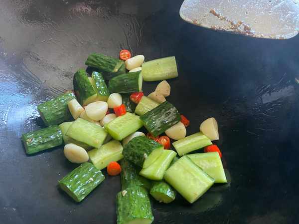 步骤3:另起一锅,放入蒜和辣椒翻炒片刻,然后再放入黄瓜翻炒片刻。