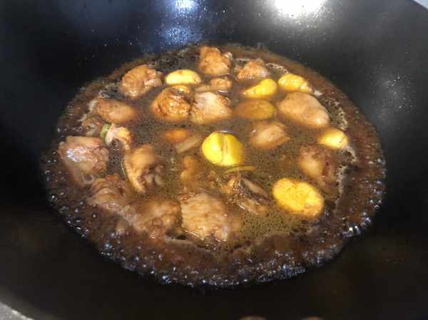 步骤3:加入板栗,然后加适量料酒和酱油,再加适量热水没过食材。