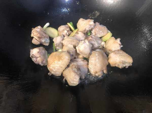 步骤2:起锅烧油,加葱姜煸炒片刻,再放入鸡翅翻炒变色。