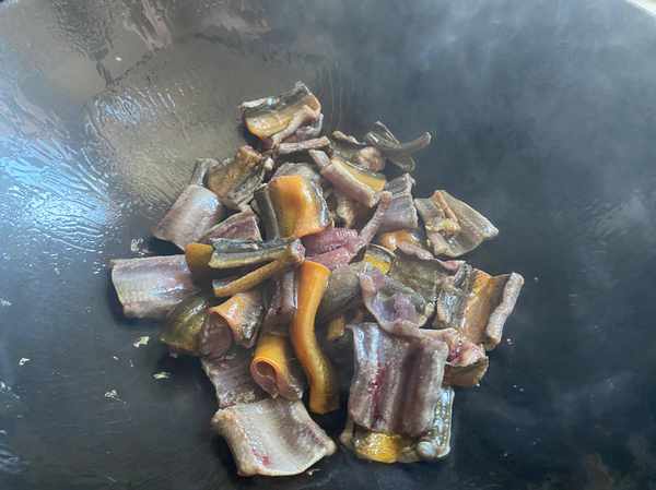 步骤2:起锅烧油,放入黄鳝段翻炒片刻,炒至变色,黄鳝段有点卷边,就关火出锅,备用。