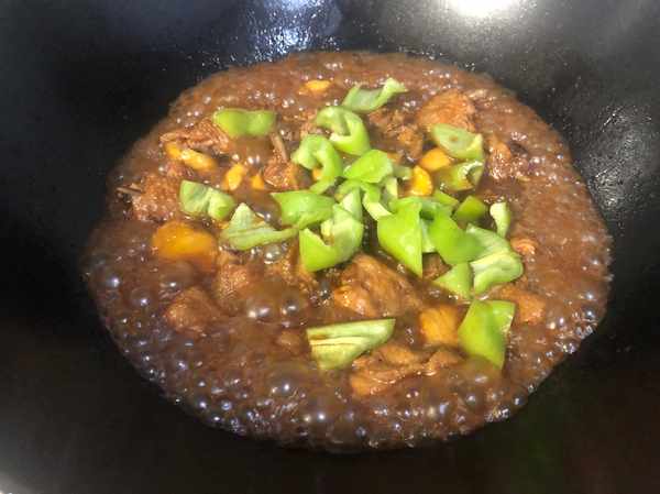 步骤4:大火烧开,转小火焖煮1个小时,最后加盐调味,加些青椒,大火收汁,就可以出锅了。