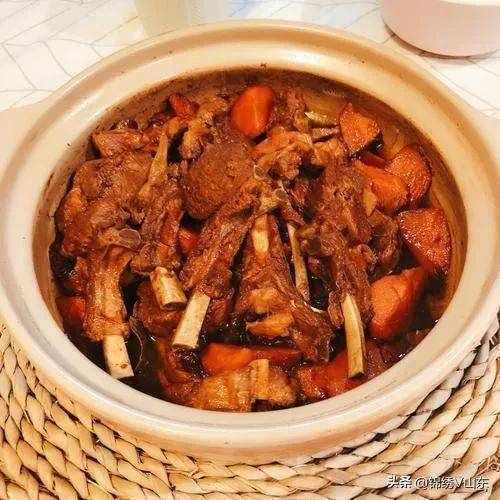 2,砂锅里放入纯净水,放入葱姜和羊排大火烧开,改中小火炖约1小时,放入胡萝卜,加盐调味,炖到胡萝卜软烂,关火出锅即成。