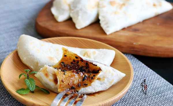 越薄越好,把红糖馅放在一半的面团上。不要用太多,否则会太甜。