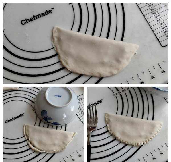 如果你会揉花边,你就能揉出漂亮的花边。我们这边比较简单,贴吧。如果想好看一点,可以用叉子压一下边缘;还是用我祖传的绝招——用碗倒扣,边缘很工整。