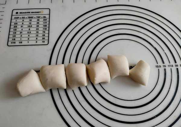 将醒好的面团分成合适的大小。我做的很小,所以我拿了一半的面团,擀成长条,做了几个小的。