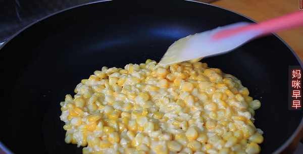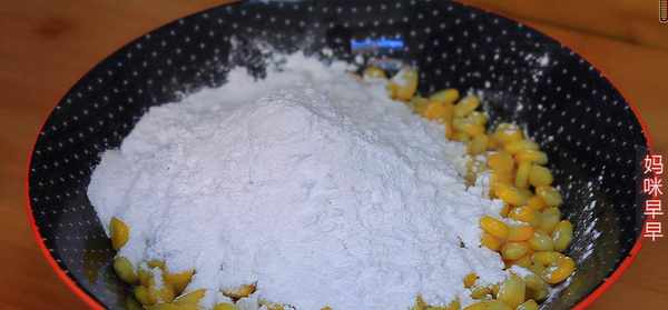 2、玉米粒取出沥干水分,加入鸡蛋2个、淀粉50克、糯米粉50克,再加入适量白糖。水果玉米本身很甜,所以糖的量不宜过多。