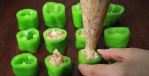 3、我们把肉末装进裱花袋里,操作简单省事,把肉末均匀挤入辣椒里。
