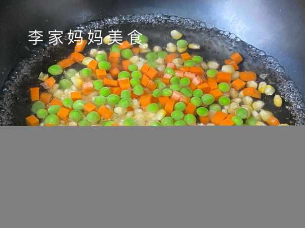 5、准备半碗水,加入生粉少许,蚝油1勺,生抽1勺,搅拌均匀。锅烧热倒油,倒入豌豆、玉米和胡萝卜,大火翻炒至熟透,约2分钟。