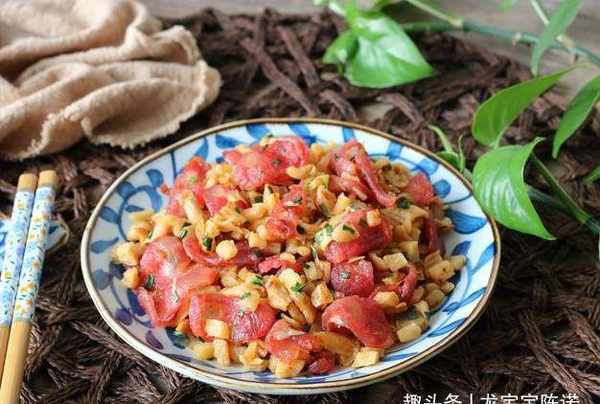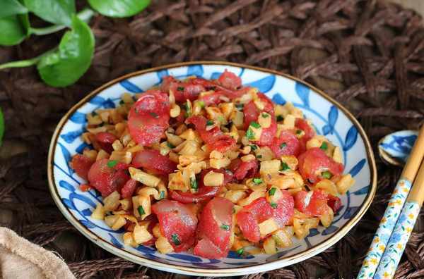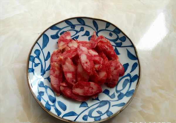 2、广式香肠切成斜刀口的薄片或圆片。如果不喜欢香肠,可以用香肠或者猪肉等代替。