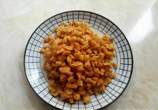 1、萝卜干用水冲洗一下,切成玉米粒大小的颗粒。不要剪得太长。