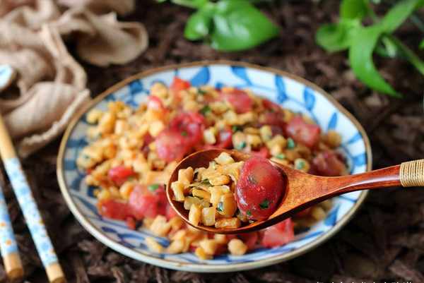 6、放入葱花翻炒片刻,加少许盐调味,翻炒至葱花融化出锅。香肠本身就有些盐分,口味重的朋友可以先尝尝,根据口味加盐。