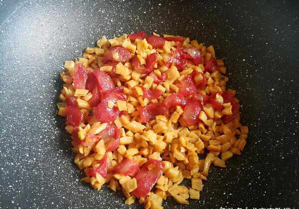 5、加入萝卜干转大火,与香肠一起翻炒均匀。