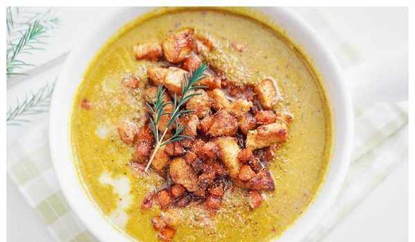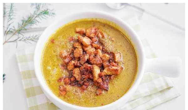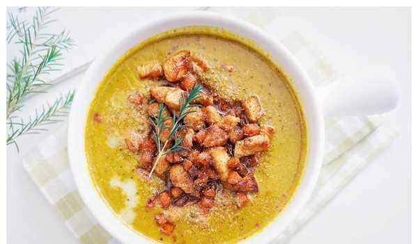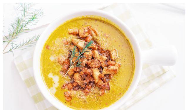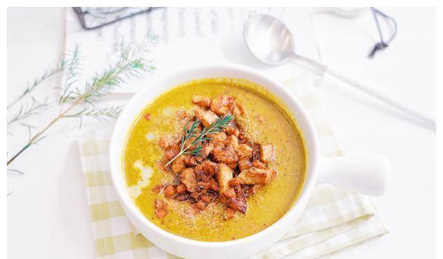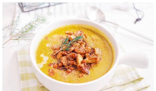 13.将打发的南瓜汤倒入碗中,用勺子倒入炸好的鸡丁和胡萝卜丁