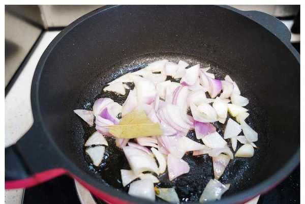 4、锅中油烧热后,将用滚刀切成块的洋葱和香叶放入锅中翻炒出香味