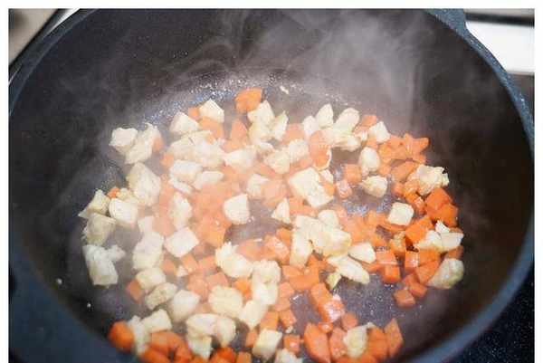 11.锅中油烧热后,加入切小块的鸡肉和去皮切小块的胡萝卜翻炒至变色