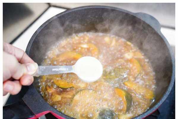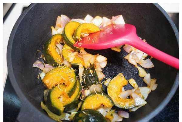 5.加入蒸好的南瓜翻炒至南瓜表面呈金黄色