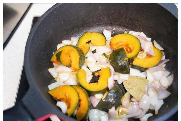 【牛奶鸡南瓜蔬菜汤】贝贝南瓜1个、鸡胸肉1块、洋葱半个、胡萝卜1根、月桂叶1片、香草1克、炼乳30克、健身调味料1克、300克开水毫升,淡盐酱油30毫升,植物油30毫升