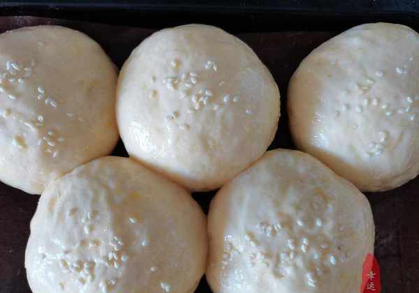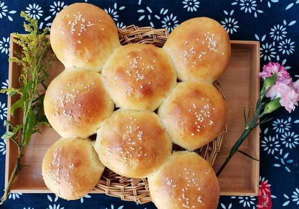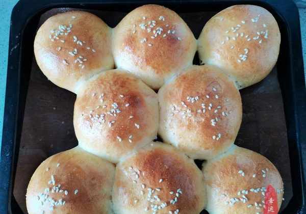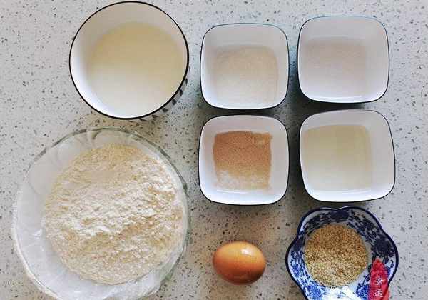 主要原料:高筋面粉250g、温牛奶160ml、酵母粉3g、白糖15g、盐1g、鸡蛋1个、玉米油10ml、白芝麻适量