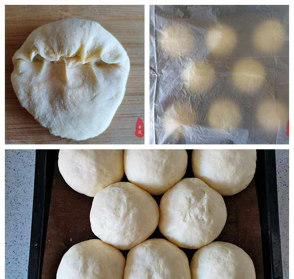 4、盖上保鲜膜,放在温暖处,发酵至两倍大。检查面团是否做好的直接方法,拉面团的时候,可以看到面团里面有很多蜂窝。先在案板上撒些干面粉,然后把面团移到上面,向内收紧,放气整形,用刮刀分成8份。