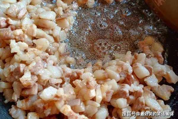 ,用锋利的菜刀,切成肉丁,肥瘦自由搭配,肥肉多了包子更香,起锅烧油,油热倒入五花肉,