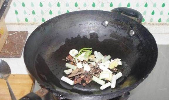 把葱姜蒜、陈皮、花椒、八角平铺在锅底。