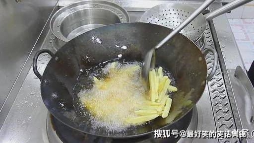 锅中烧油,油烧至5成热(微微冒烟时),倒入土豆条,炸制大约两分钟,用勺子轻轻一敲就断,把土豆条炸成金黄色,