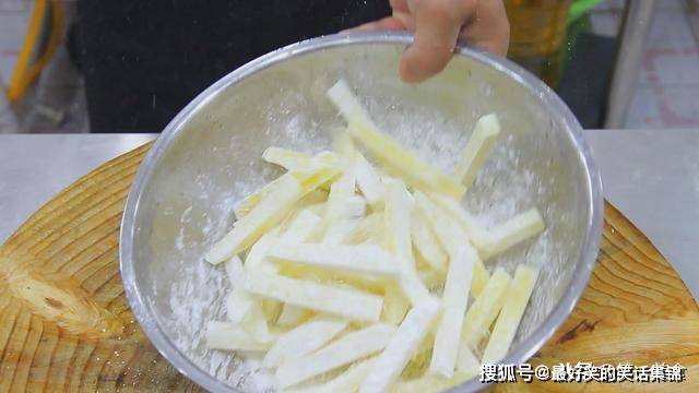 炸至土豆条外酥里软后,倒出控油。
