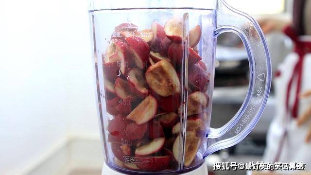 3.然后,把山楂果放在打浆机中,加入一点清水,盖上打浆机的盖子,把山楂果打碎,有打不到的地方用筷子搅一搅,再继续打一会。