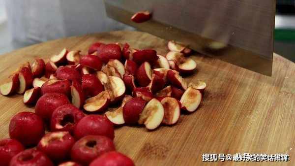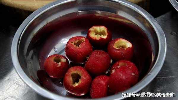 2.捅出以后放在盆中,加入清水再清洗一次,干净以后控干水分,放在案板上面从中间切开,把每个山楂果都从中间切成四份。
