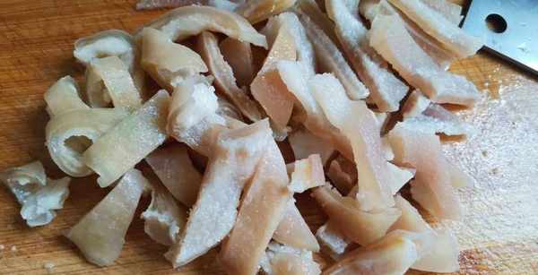 猪皮一定要煮透,这样做出来的猪皮才会足够好吃,所以猪皮炖煮30分钟后不要急着捞出,先用筷子戳一下,如果能够戳透,猪皮就做好了,如果不能戳透,猪皮可能还需要再煮一段时间,猪皮煮好以后捞出晾凉,然后放在案板上切成小块,接着将切好的猪皮放入盘中备用。