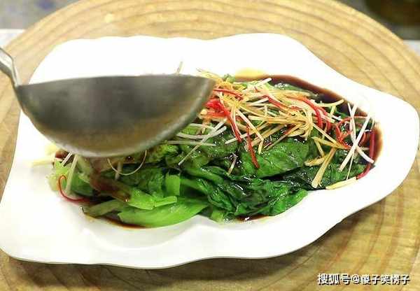 4.把控过水的生菜颈部朝同一方向摆放在盘中,再撒上葱丝、姜丝、辣椒丝等辅料。