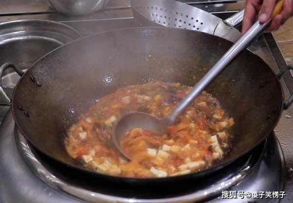 5.锅内烧油,油烧热以后,把番茄丁倒入锅中,加入一勺食盐方便炒出番茄汁,番茄炒软、炒碎以后,沿锅边加入适量的清水,倒入豆腐和肉丝,把虾米和紫菜也放入锅中。